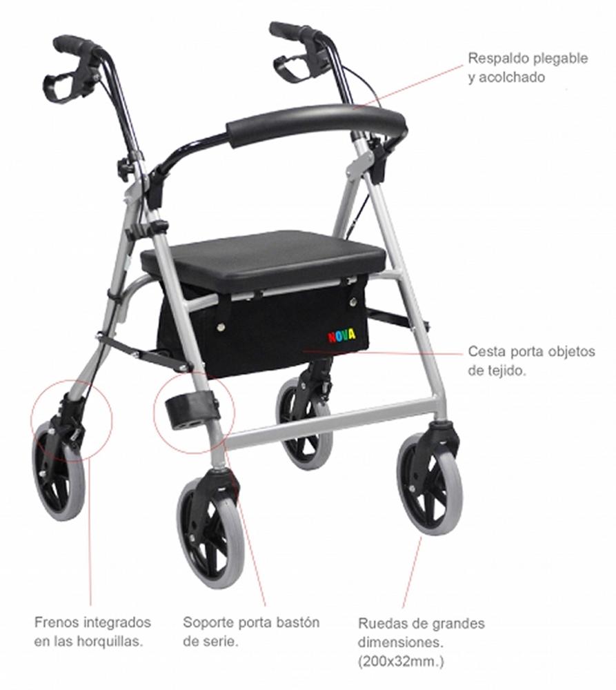 Cesta de lona situada debajo del asiento y soporte para bastones incluido.