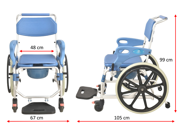 Silla de ducha y WC con ruedas de 24" (autopropulsable) con asiento con Inodoro anatómico fabricada en aluminio que aporta ligereza, cuenta con WC incorporado que facilita la higiene íntima al usuario, siendo un producto realmente versátil que puede usarse directamente sobre el inodoro o utilizar el orinal.