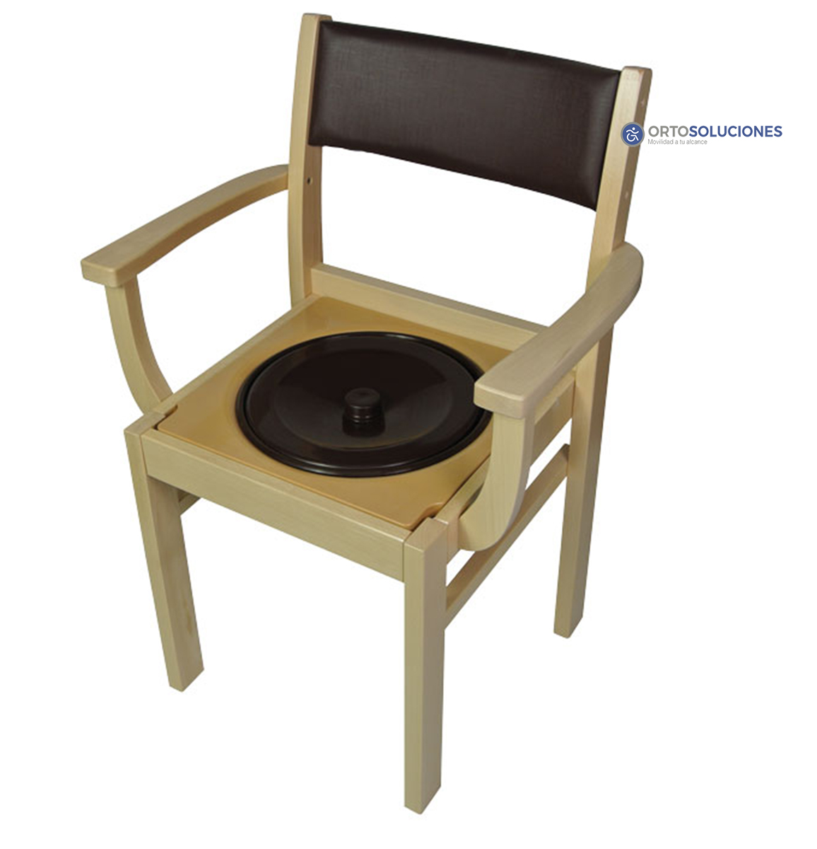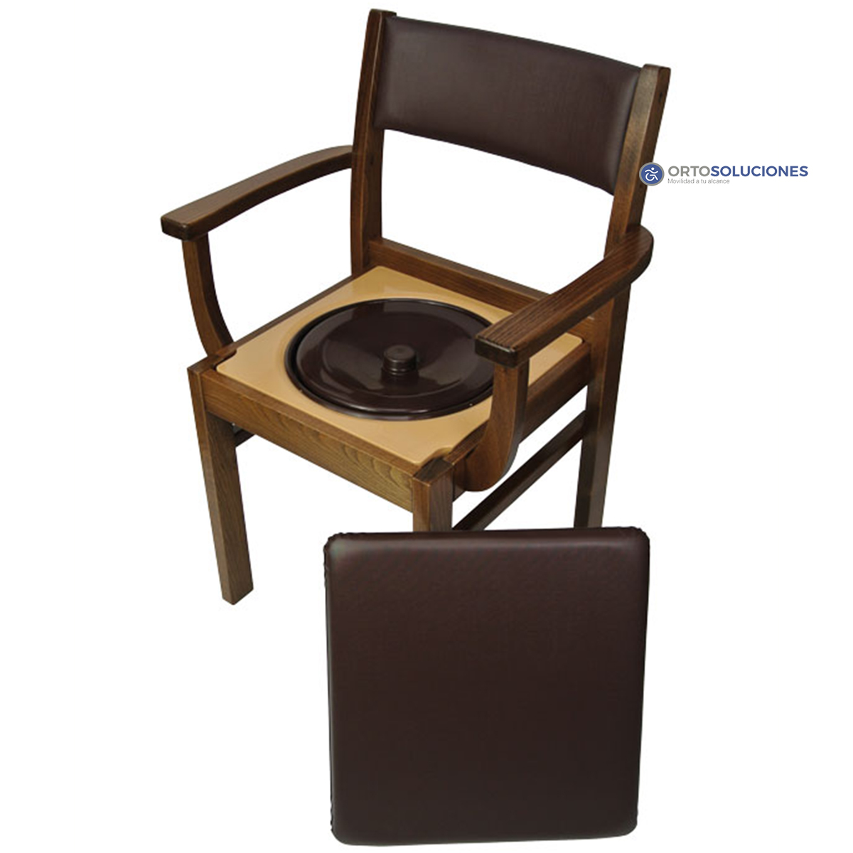 Silla de inodoro de madera muy discreta para usarla en cualquier habitación. Siento y respaldo de espuma para mayor confort. Orinal de PVC extraíble de serie