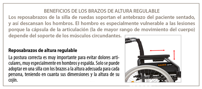 Gracias a sus reposabrazos regulables se puede conseguir una correcta sedestación del usuario.