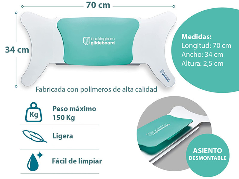la  Glideboard ofrece mayor seguridad a la hora de realizar la transferencia de la silla de ruedas a la cama, y el asiento deslizante reduce la fuerza y tensión que deben realizar tanto el usuario como el cuidador hasta en un 30%.